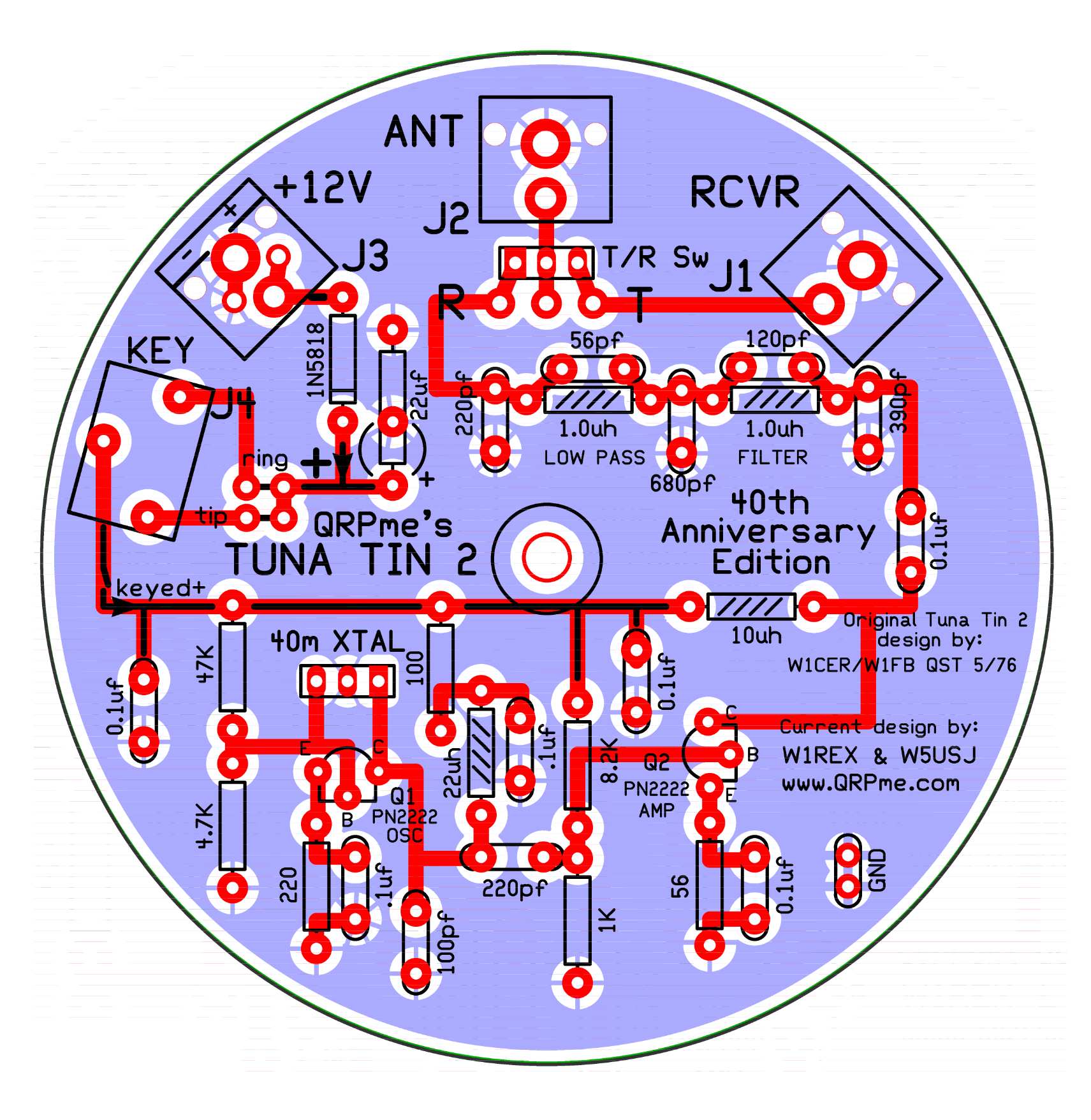 In 2011, QRPme offered up a 35th anniversary version TT2 then followed by another version with a built in RF Probe. This latest 40th anniversary issue is an upgrade to both earlier versions and brings it totally up to date. The major changes to these earlier designs are larger pads, traces and clearances deletion of an earlier on board RF Probe. For overall clarity, the parts are laid out on the board in the exact same way the schematic is drawn. The toroids and transformer have been replaced to both reduce the complexity and time of the build. ALL the connectors are mounted directly to the board so there is no external wiring to mess around with. The pads, traces and spaces are BIG to help reduce soldering problems for beginners. All the components are supplied with the kit so all you need are tools, soldering iron and solder. Of course, you will need to come up with a can to mount your finished kit on... You could have a tuna fish sandwich for a snack while you build the kit. I prefer a small can of DOLEs pineapple chunks. Look for a tuna fish or pineapple can with a pull top lid! After you pull the tab, a small lip remains on the outside rim of the can. The TT2 board sits on this lip and is held onto the can by a bolt through the board and bottom of the can. You will have to drill a hole in the bottom of your can to mount the board....