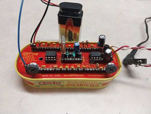 The Cento Receivo receiver is a simplified version of QRPme*s Sudden Storm receiver kit. The simplification is in the elimination of the band module and operation set for 40m. Another feature is it can be built without a soldering iron. Just form and cut the leads as required by the board and push them into the socket pins. You will need to solder up an adapter cable for your headphones. Although you CAN install the battery, antenna and phone leads directly into the pin sockets, for easy messing about, I BUILT some mini connectors using push extra socket pins to make plugging and unplugging the external devices easy peasy while debugging my prototype.